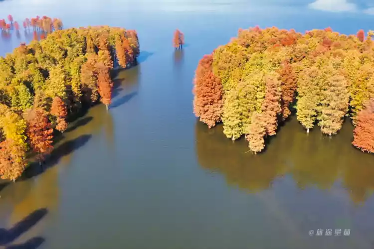 At the end of November, the Metasequoia trees have begun to turn red. The red, orange, yellow and green colors are very layered under the slanting sunlight. The vast tracts of Metasequoia trees, the blue sky and white clouds, and the breeze-swaying Siming Lake merge into a dynamic picture.