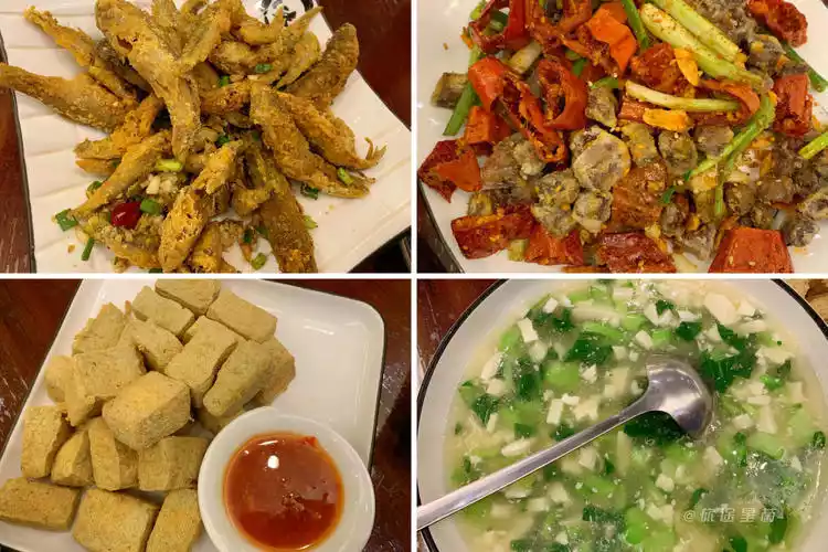 We kept filming until the sun went down, then went straight to the restaurant for lunch. We ordered four dishes, including the salt and pepper stream fish, which we hadn't had at lunch, and the others were stinky tofu, crispy veal, tofu soup, and two drinks. The portions were generous and the taste was good. While eating, Peng Ge didn't forget to complain about the lunch, saying that if the lunch was like this, he would be happier in the afternoon.