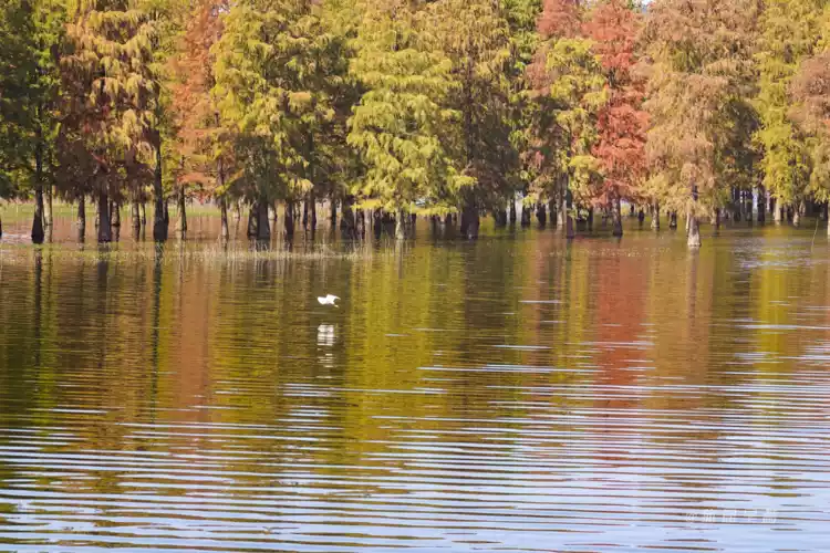 Metasequoia trees stand in the water like pagodas, towering into the clouds. Occasionally, birds fly by, as if they are also appreciating the beauty of the Metasequoia trees.
