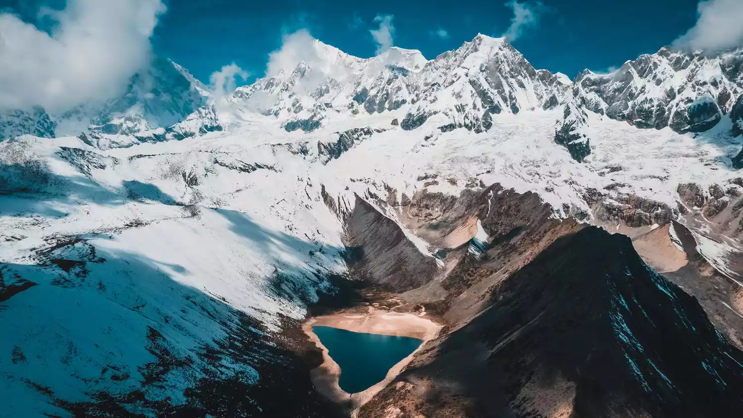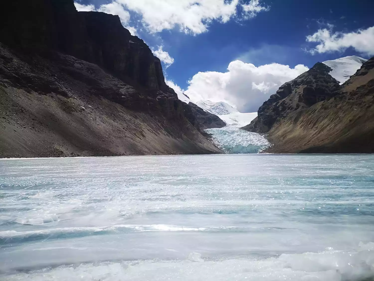 Outdoor enthusiasts will be familiar with this mountain. Located on the border between China and Bhutan, 270 kilometers from Lhasa, it's one of Tibet's most classic hiking routes. Surrounded by six 7,000-meter-high snow-capped peaks, it forms the Kula Kangri Snow Mountain Group. The towering peaks create a natural barrier, nurturing numerous magnificent plateau lakes. In winter, Kula Kangri's mountains blend with the snow, and the lake intertwines with the ice, creating a truly spectacular sight.
