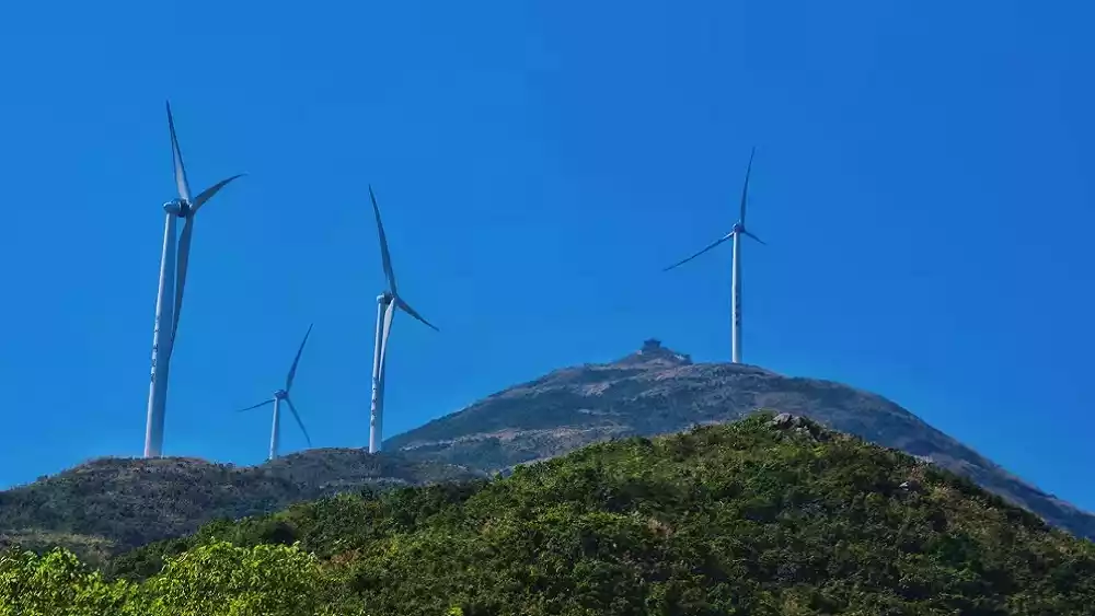 Rising tall among the green mountains and forests, the silver-white windmills, together with the blue sea, blue sky, beach, wetland and pristine countryside, form a beautiful scene on earth.