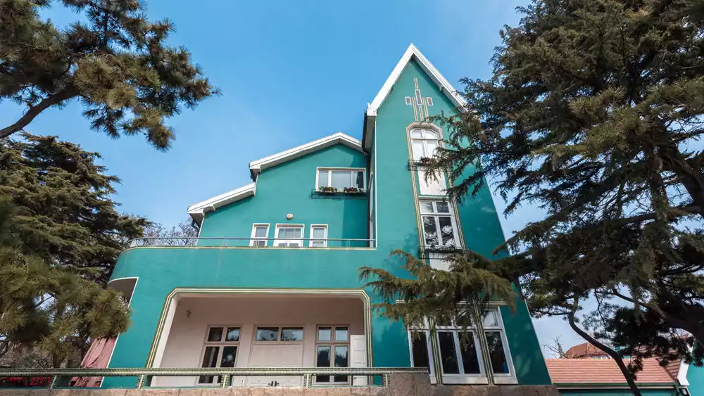 The most spectacular wisteria in the old city is in the courtyard of Qingdao Art Museum near Xiaoyu Mountain. Strings of wisteria hang down like waterfalls, and together with the architectural complex of Qingdao Art Museum, it integrates styles of different religions. It is also a unique example in Chinese architectural history. Opposite the flower stand is one of the Buddhist-style buildings, which is particularly beautiful for taking pictures.