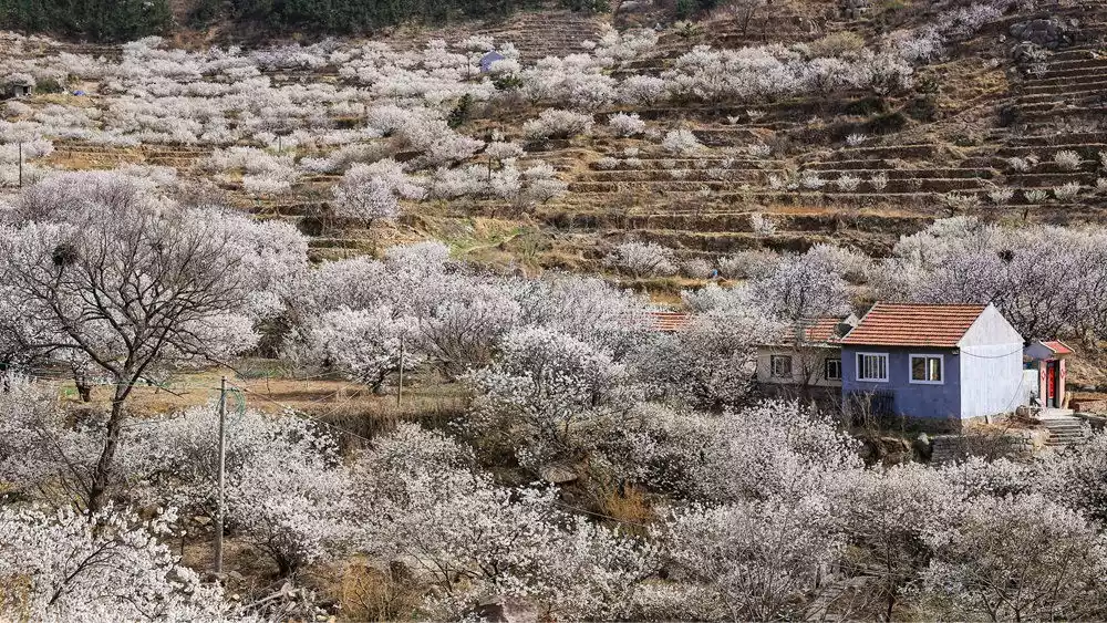 Cherry blossoms are in full bloom, blanketing the mountains like mist and clouds, creating a fairyland-like scene. Some are already in full bloom, while others are still buds, creating a vibrant interplay of pink and white. Local fruit farmers explain that the cherry trees here in Laoshan are the first to bloom, so every spring, the area is bustling with visitors eager to admire the blossoms. Throughout Beizhai Subdistrict, there are approximately 400,000 cherry trees.