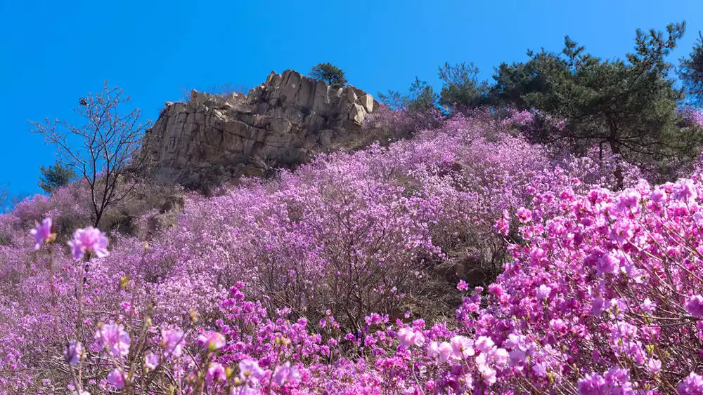 Dazhushan is known as "the first mountain to bloom crimson in spring," where vast expanses of azaleas transform from pink to purple, instantly painting the hillsides red. Dazhushan's "Three Sisters of Azaleas"—the blue broom, the mountain azalea, and the Kongtong flower—each possess unique characteristics. The blue broom, which blooms earliest and lasts longest, is at its peak around the Qingming Festival. The vibrant azaleas open in mid-April, and the Kongtong flower reaches peak bloom in late April, lasting until May. A trip to Qingdao is a must, to enjoy the spring, pray, and see the blossoms.