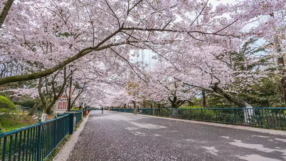 Qingdao's Zhongshan Park is renowned for its early spring cherry blossoms. The park boasts over 2,000 single and double cherry trees, primarily single. All are Japanese, with the Somei Yoshino (single cherry) being the most common. A 660-meter-long Cherry Blossom Street is lined with cherry trees.