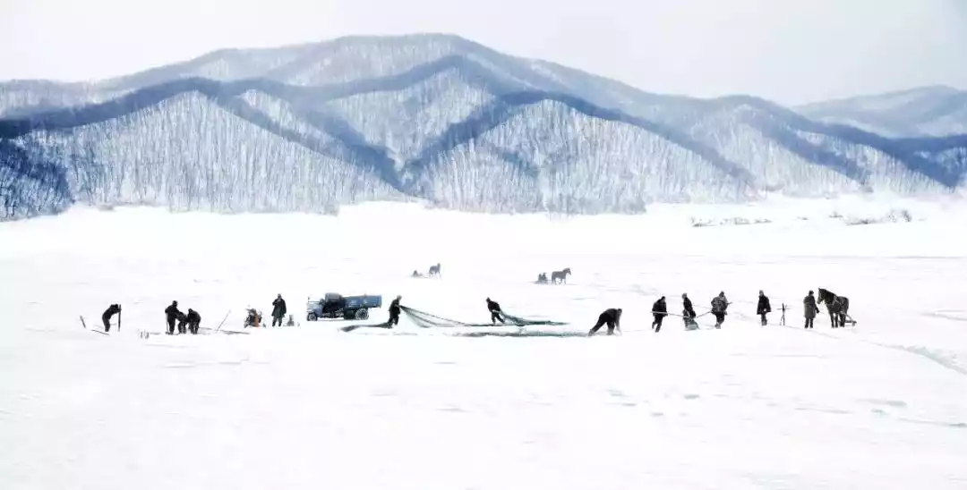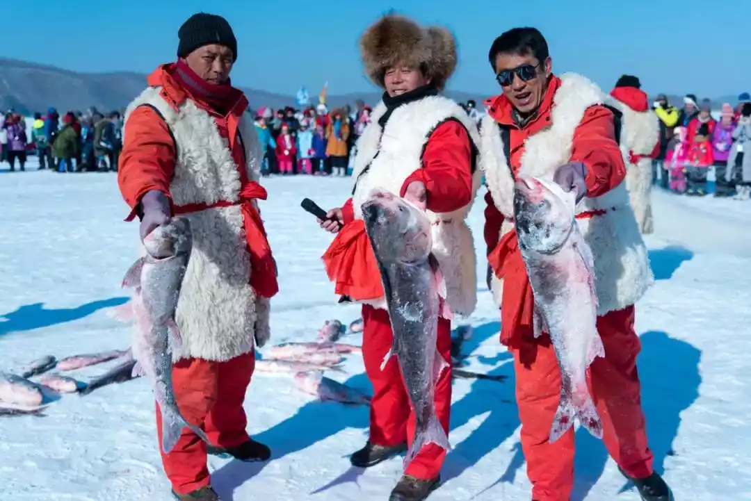 Early in the morning, a team of people brought a big iron hammer, dug a hole in the ice on the lake, put a net in, and then dug from the other side to pull the net out. With the passionate slogan of "Big fish, here they come, big fish, here they come", big fat fish swam up the net, and a lively and joyous folk performance came to a successful conclusion.