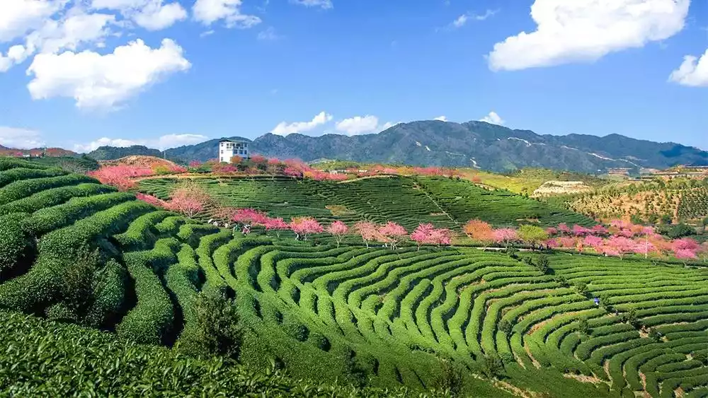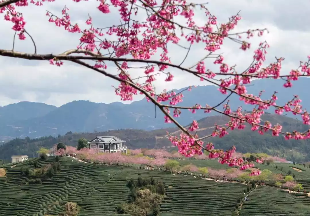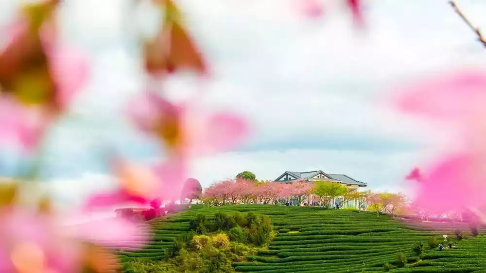 This is also the largest high-mountain oolong tea production base in China. Hidden within this sea of green tea is a cherry blossom garden, where tea fields interspersed with cherry blossoms create a striking contrast. Where else can you find such a unique and picturesque scene, where can you find the charming cherry blossoms and the fragrant tea blossoms that fill the mountains?