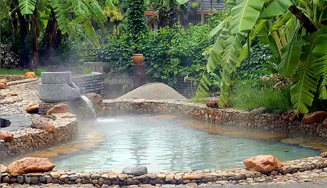 The outdoor pool is nestled within the courtyard, creating a sense of pampered tranquility. Nude soaking by appointment ensures privacy while allowing the body to fully absorb the minerals and trace elements of the natural hot springs.