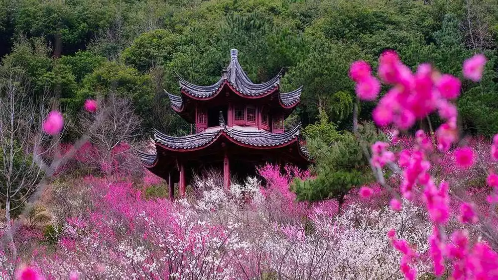 China-TravelNote's exclusive "Poetic Plum Blossom Route," combining "historic trails and blossom viewing," is the perfect spring outing. The 8-10km hike to the summit of Jiufeng Peak is a moderate distance with easy access, perfect for a family outing.