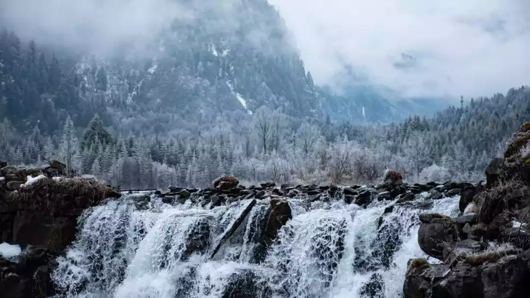 The "icicles" hanging on the river bank and the ice bridge gradually taking shape not far away form a peculiar "Ice Flowing Fork Bridge". If you go there at noon, you can even see a rainbow.