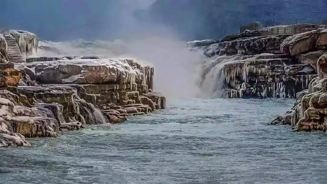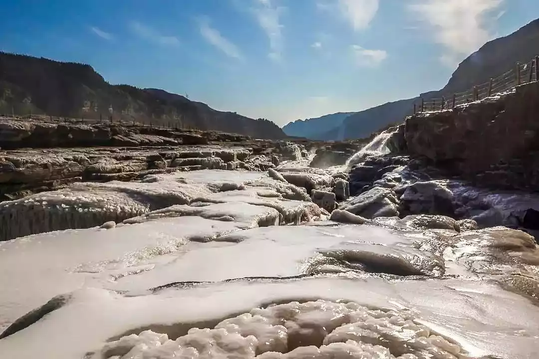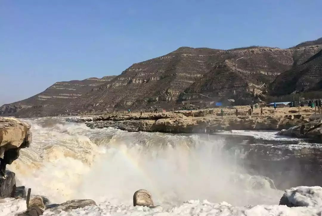In February, at the Hukou Waterfall on the Yellow River, you can stand on the shore to admire the glacier and listen to the sound of the Yellow River rushing beneath the surface.
