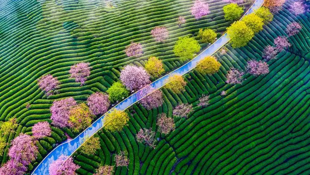 This is also the largest high mountain oolong tea production base. The cherry blossom garden is hidden in this green tea sea. The tea fields are interspersed with cherry blossoms, which complement each other and are particularly romantic.