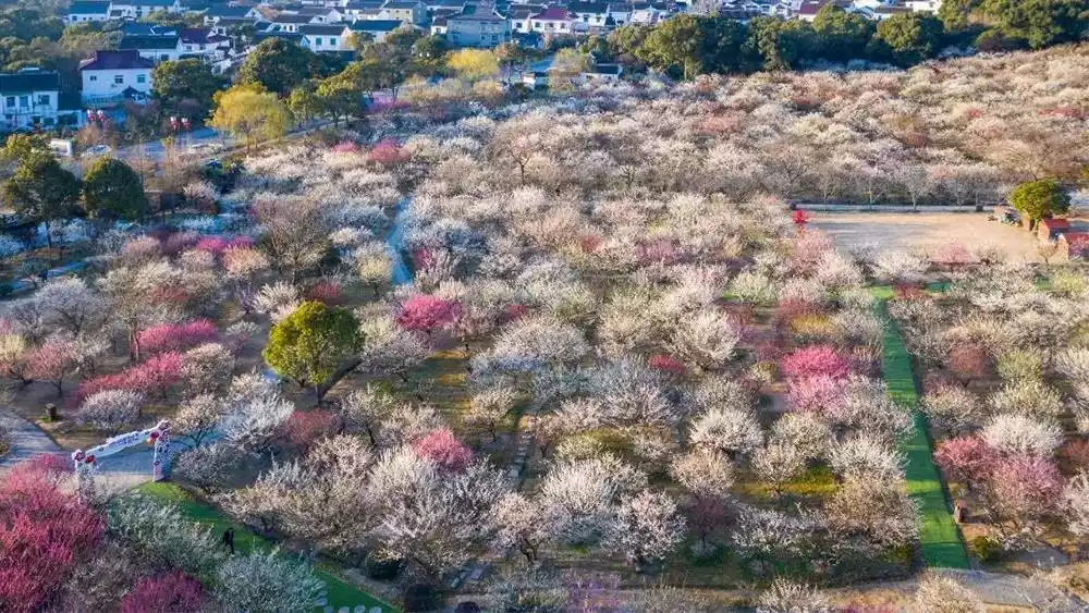 Looking around, flowers are in full bloom, the mountains are green and plum blossoms are gorgeous. Passing by the plum forest, the faint fragrance is so refreshing that you can't help but linger there.