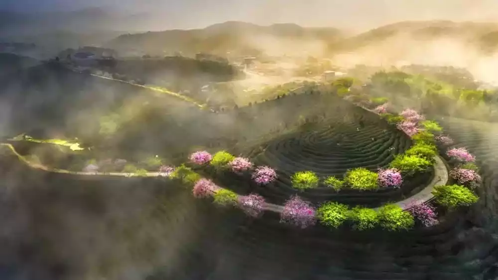 This is also China's largest high-mountain oolong tea production base, and the cherry blossom garden is hidden in this green tea sea. The tea fields are interspersed with cherry blossoms, which complement each other and create a particularly romantic atmosphere. Whether you travel alone or with friends, you can find different enjoyable things here.