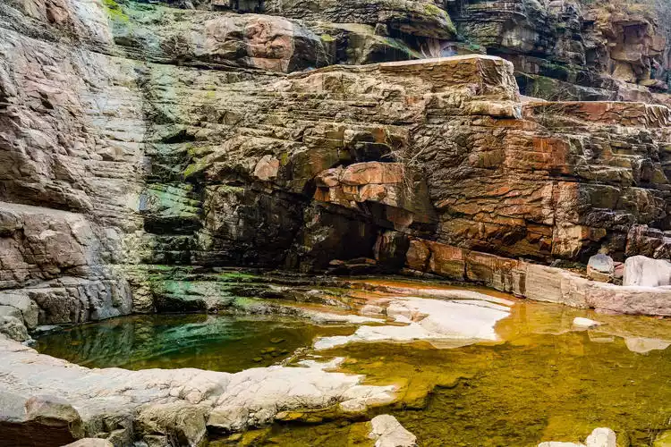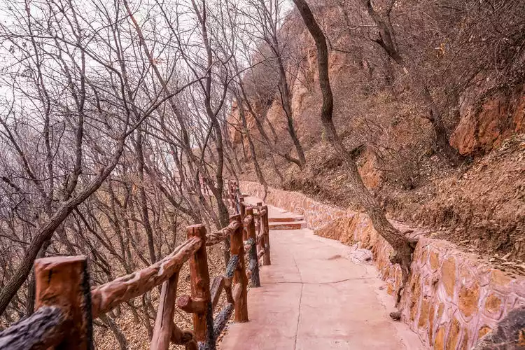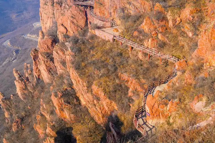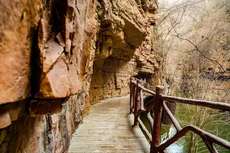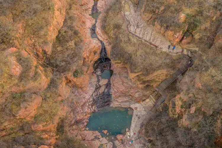 Fuxi Grand Canyon is the closest red rock canyon to Zhengzhou and boasts the largest drop in elevation. Climbing the steps along the canyon entrance, the 5-kilometer route features interconnected waterfalls and cascading pools. Strolling beneath cliff corridors, you'll wander through the mountains and waters, its winding path transforming with every step.