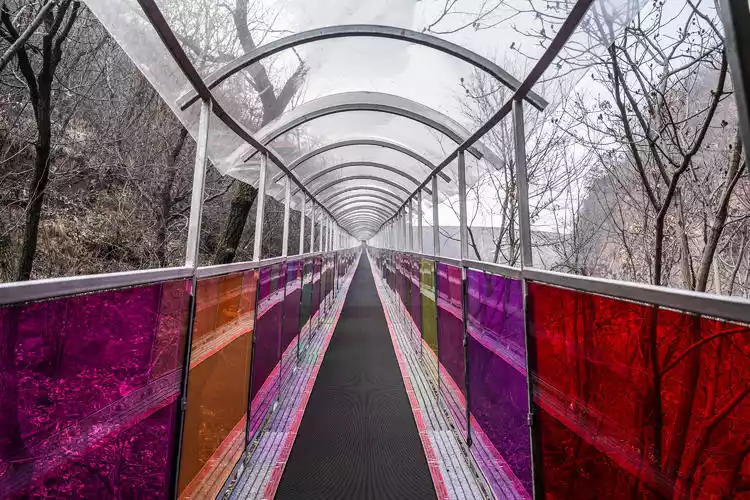 It is paved with 150 pieces of triple-layer tempered laminated glass, 360 meters above the canyon floor, with the corridor extending 30 meters out of the cliff. It is nearly 9 meters longer than the glass corridor of the famous Grand Canyon in the United States, known as the "Eighth Wonder of the World". The bridge adopts a cable-free design, and the overall steel consumption of the project exceeds 3,000 tons. It is known as "the longest glass corridor in the world" and is also one of the classic camera positions for viewing the panoramic view of the valley.
