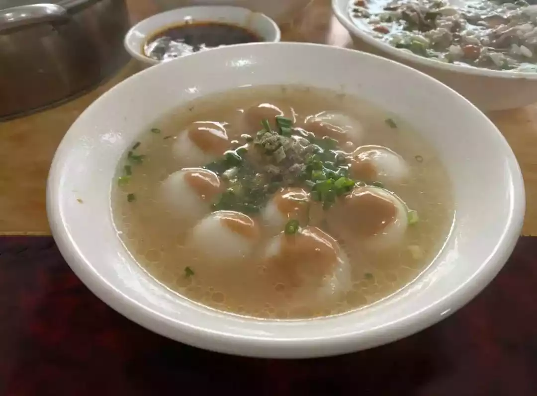 Zouji Chicken Tangyuan is a time-honored Xingyi establishment. Their minced free-range chicken is used to wrap the dumplings, creating a delicious and fragrant tangyuan. The broth, in addition to the bones, also includes a sauce made from ginger, pepper, and other spices. The sauce is incredibly rich and balanced. They also serve "Shuabatou," a type of steamed bun stuffed with bamboo shoots, served with a dipping sauce. The broth is incredibly delicious.