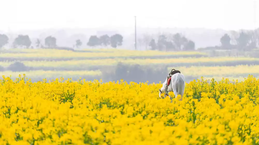 Gaochun boasts over 200,000 mu (approximately 1,000 hectares) of rapeseed fields, most of which are situated in hilly terrain. From a high vantage point, the view stretches as far as the eye can see, resembling waves rising and falling, as if you were immersed in a sea of rapeseed flowers. Like Wuyuan, the rapeseed fields are nestled among numerous whitewashed and gray-tiled buildings, adding to the unique and vibrant scenery.