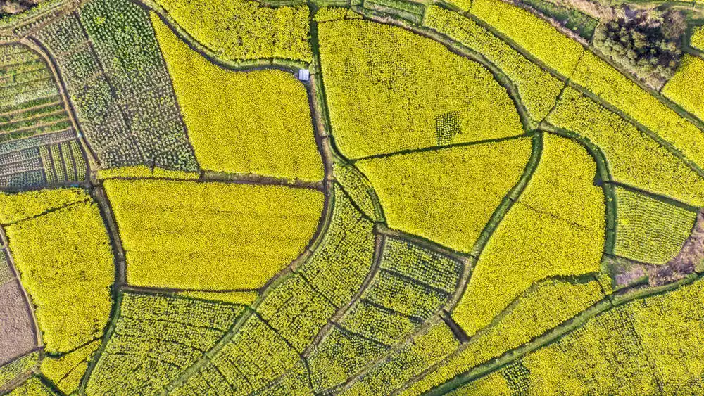 When rapeseed enters its flowering season, the fields are ablaze with golden color. Yu Shao's poem evokes the idea: "Rapeseed blossoms cover the ground in yellow, butterflies dance and bees bustle among the bushes; the gentle breeze sweeps across the golden waves, emitting an intoxicating, rich fragrance." When the flowers bloom, they attract butterflies and bees to flit among the blossoms. The rich fragrance is intoxicating, and the beautiful scenery invites lingering.