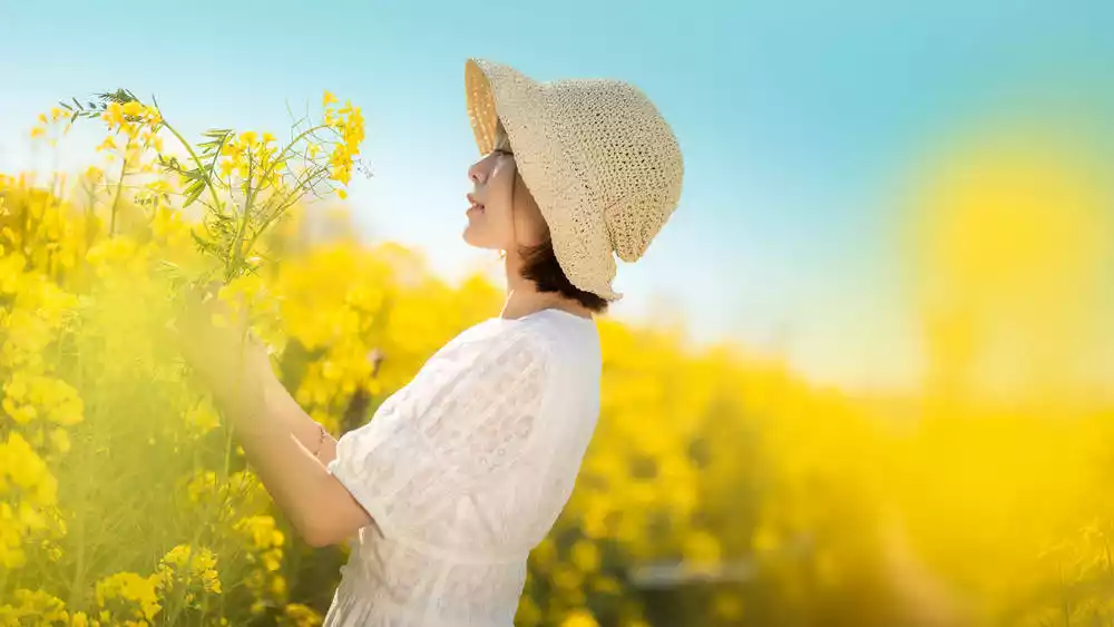 A golden blanket spreads across the fields, emitting the intoxicating fragrance of rapeseed blossoms. Spring is the perfect time to walk onto the ridges, immerse yourself in a sea of flowers, and enjoy the gifts of spring! Rapeseed flowers are a perfect springtime photo opportunity. Wearing a white dress and a straw hat creates a very artistic look.