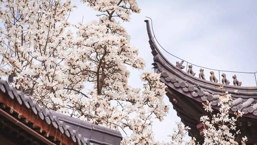 Chaotian Palace is the largest, highest-ranking, and best-preserved ancient architectural complex in the Jiangnan region. It served as a royal temple for Ming Dynasty nobles to pray. It's also the perfect spot for viewing magnolias. The white magnolias complement the yellow and green glazed tiles, creating a stunning and solemn scene.