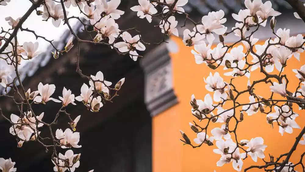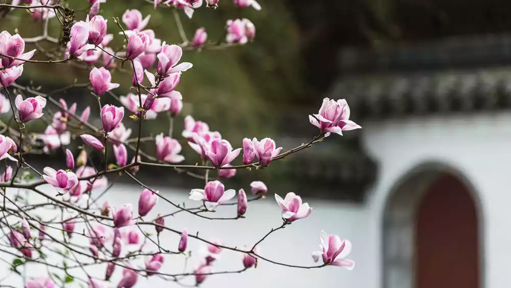 "The colorful dresses are newly dressed for the evening, the white dresses are graceful and elegant in the Jade Palace. Already a faint halo has formed on the red clouds, so the dew becomes a fragrant dust." The magnolia's elegant temperament clearly distinguishes it from other spring flowers. It stands proudly in Nanjing, yet it is hard to take your eyes away. I have seen magnolias in both white and pink, and both colors are a perfect match for ancient architecture.