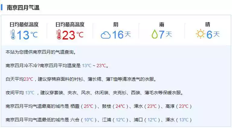 The average temperature in Nanjing in April ranges from 13°C to 23°C. With daytime temperatures averaging 23°C, it's recommended to wear warm clothing such as windbreakers, casual wear, and light sweaters. Nighttime temperatures average 13°C, so it's recommended to wear warm clothing such as windbreakers, coats, overcoats, jackets, sweaters, wool suits, and winter clothing.