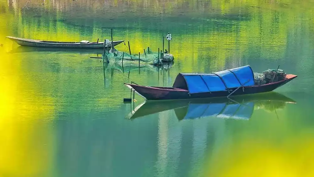 The riverbank near Pukou Village boasts a magnificent 800-year-old camphor tree. With clear water, dotted fishing boats, and winding green hills on both sides, it's the perfect time for an outing and flower viewing.