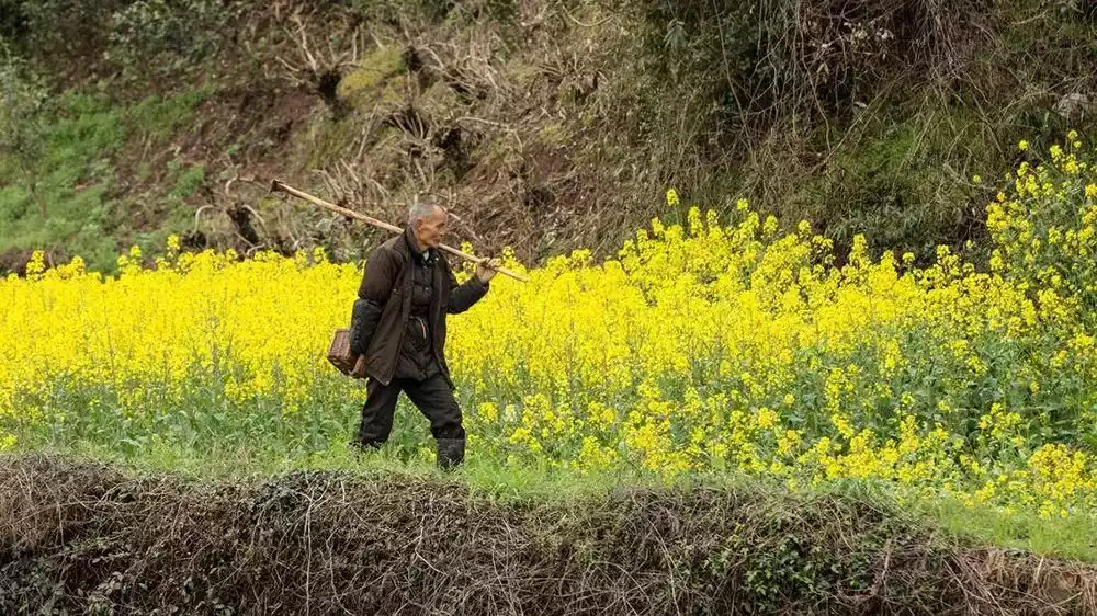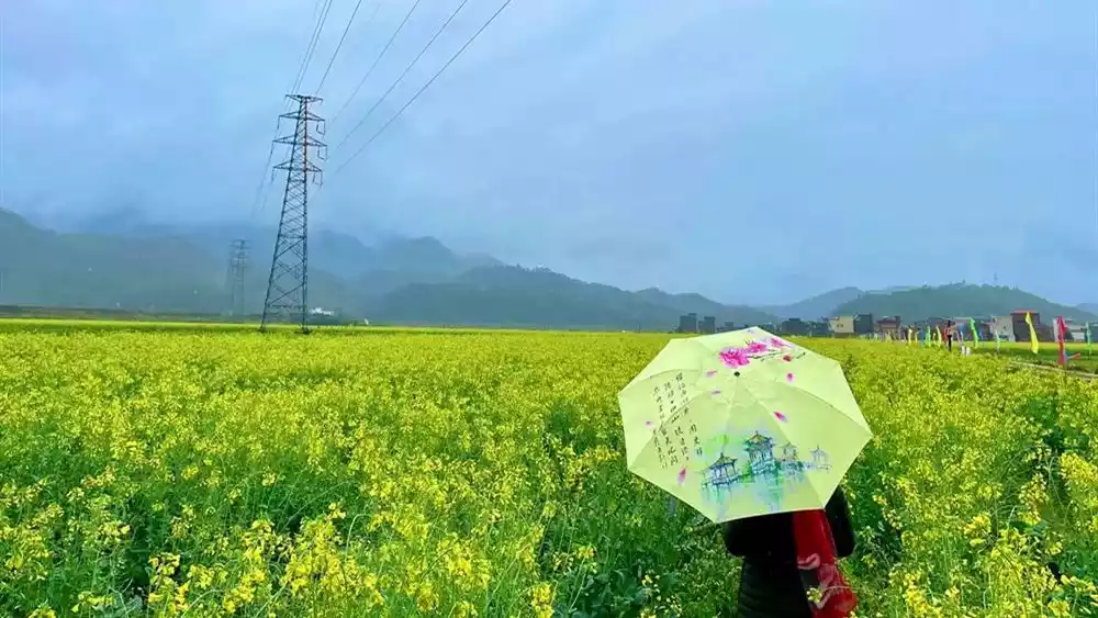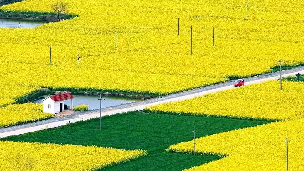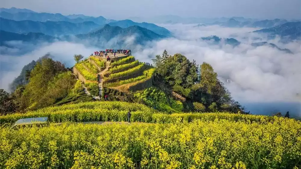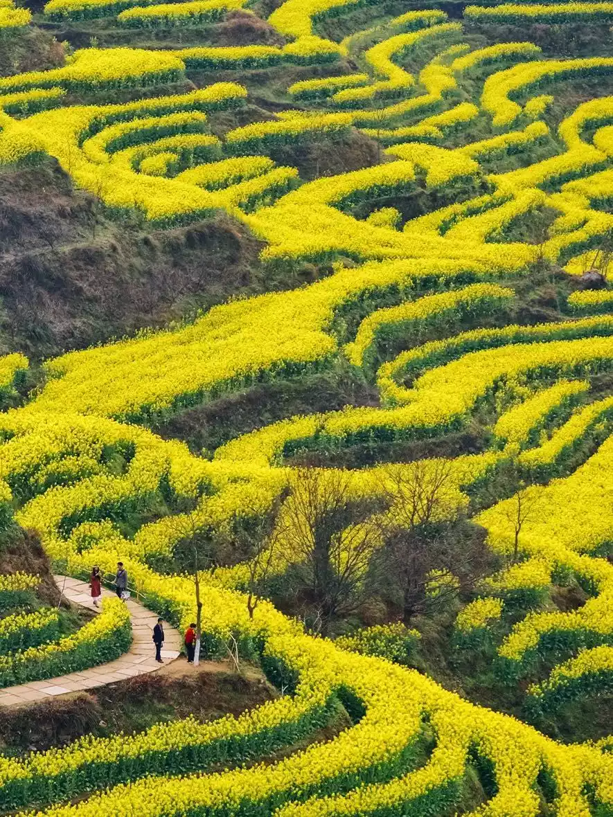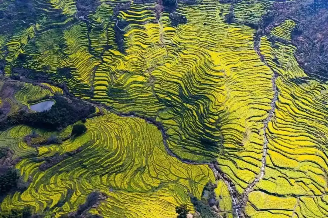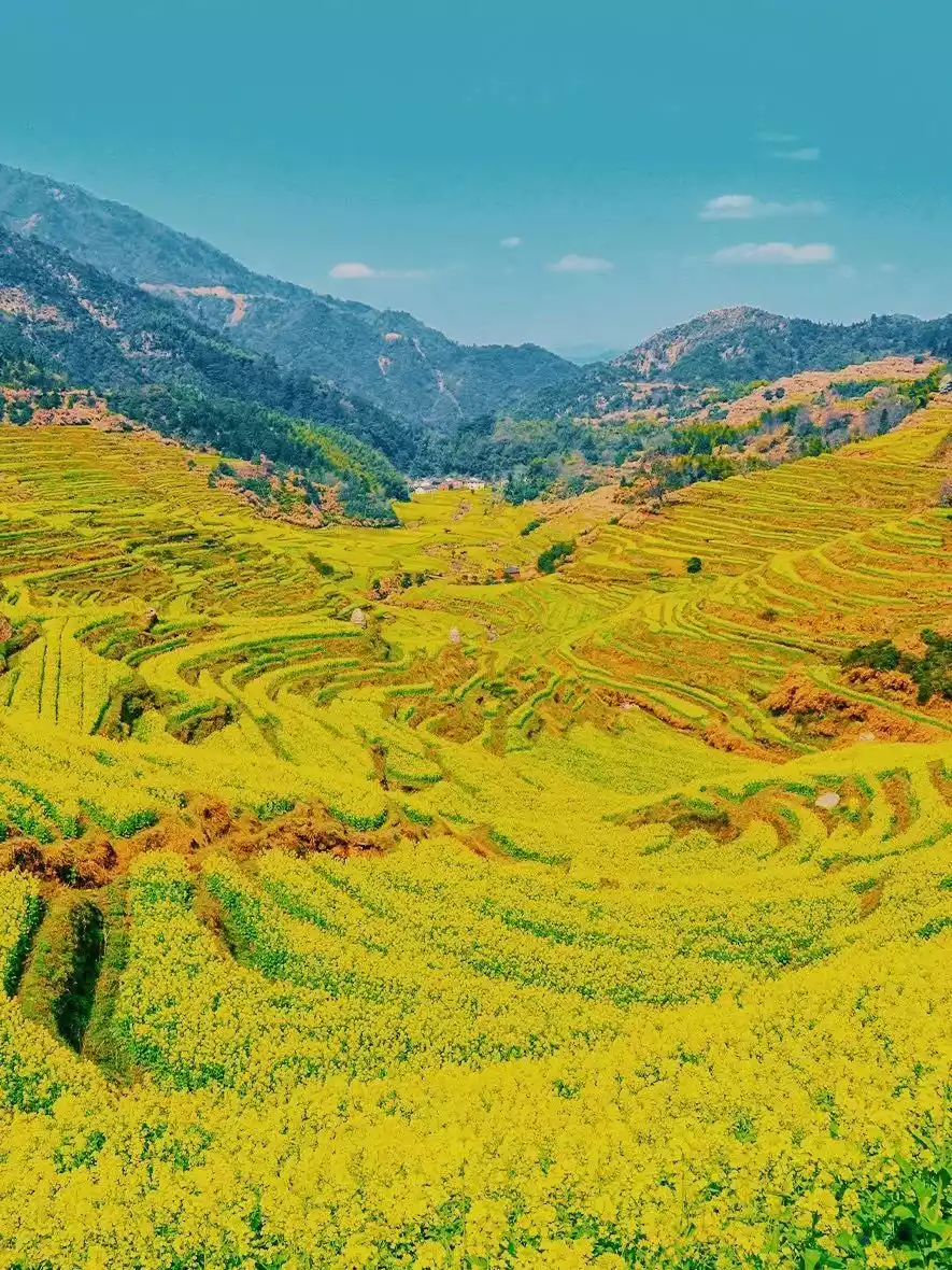 Jiangling, in the northeast corner of Wuyuan, is the most iconic spot for viewing rapeseed blossoms. Terraced fields of rapeseed flowers blanket the hills, stretching from the valley to the summit. Standing on the summit, looking down, you'll see endless layers of blossoms, a vibrant expanse of life.