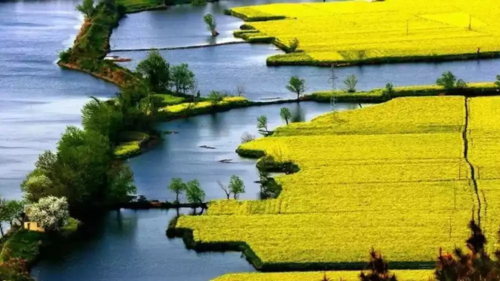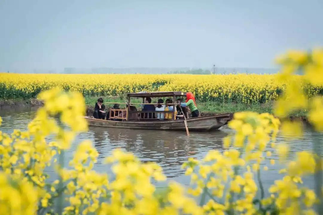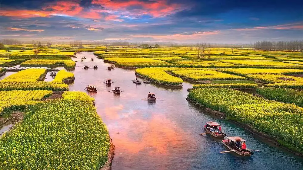 From a high vantage point, the rapeseed flower fields, thousands upon thousands of them floating in the water, resemble bonsai trees grown in the water, creating a truly spectacular spectacle. Elegantly sailing through the intricate waterways of the flower fields in a wooden boat, one feels as if one is "traveling in a painting."