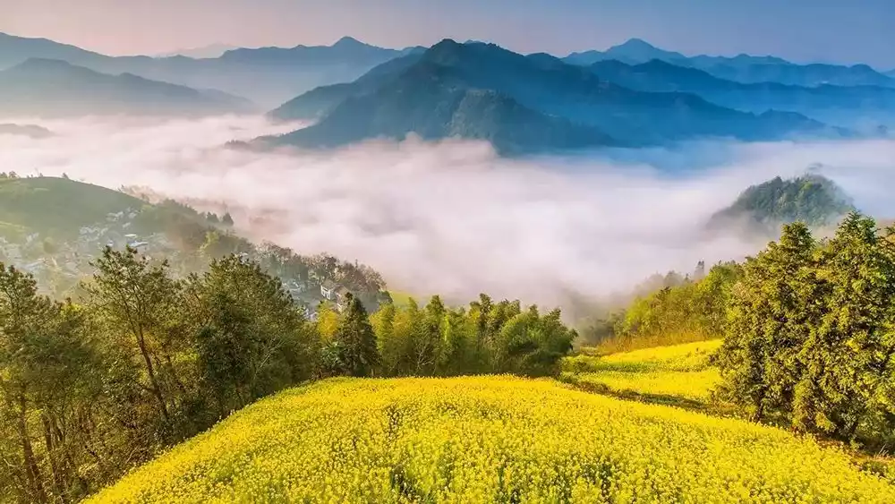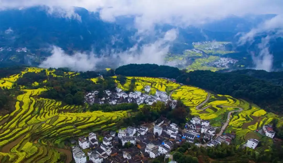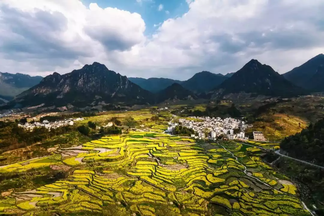 Come to Huangshan to find an old dream of Huizhou, and have a scenic afternoon tea at the golden undulating rapeseed terraces in Jiapeng Township, overlooking the entire sea of flowers, which are layered and stretch to the foot of the distant mountains, with dotted villages hidden among them.