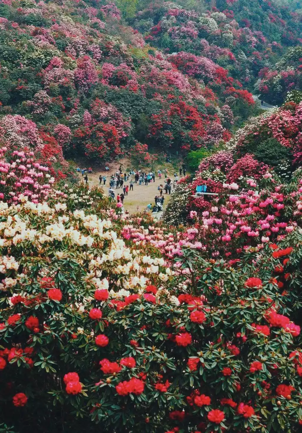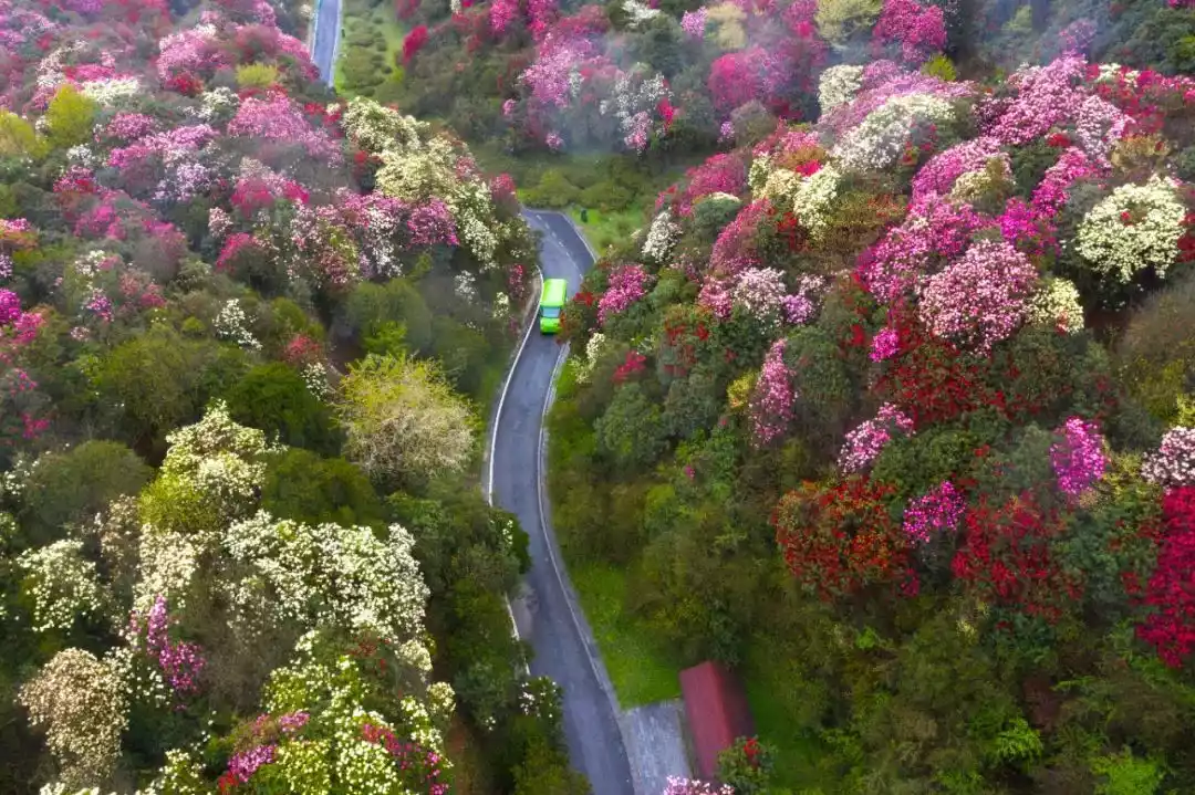 The scenic area is awash with rolling hills and endless flower-filled mountains, including scenic spots like Zuijiuniu, Shexiangling, Wucai Road, and Shuhua Peak. Wucai Road boasts a relatively concentrated and diverse selection of azaleas, and during peak bloom, the roadside is lined with a dazzling display of fallen petals, creating a breathtaking sight.