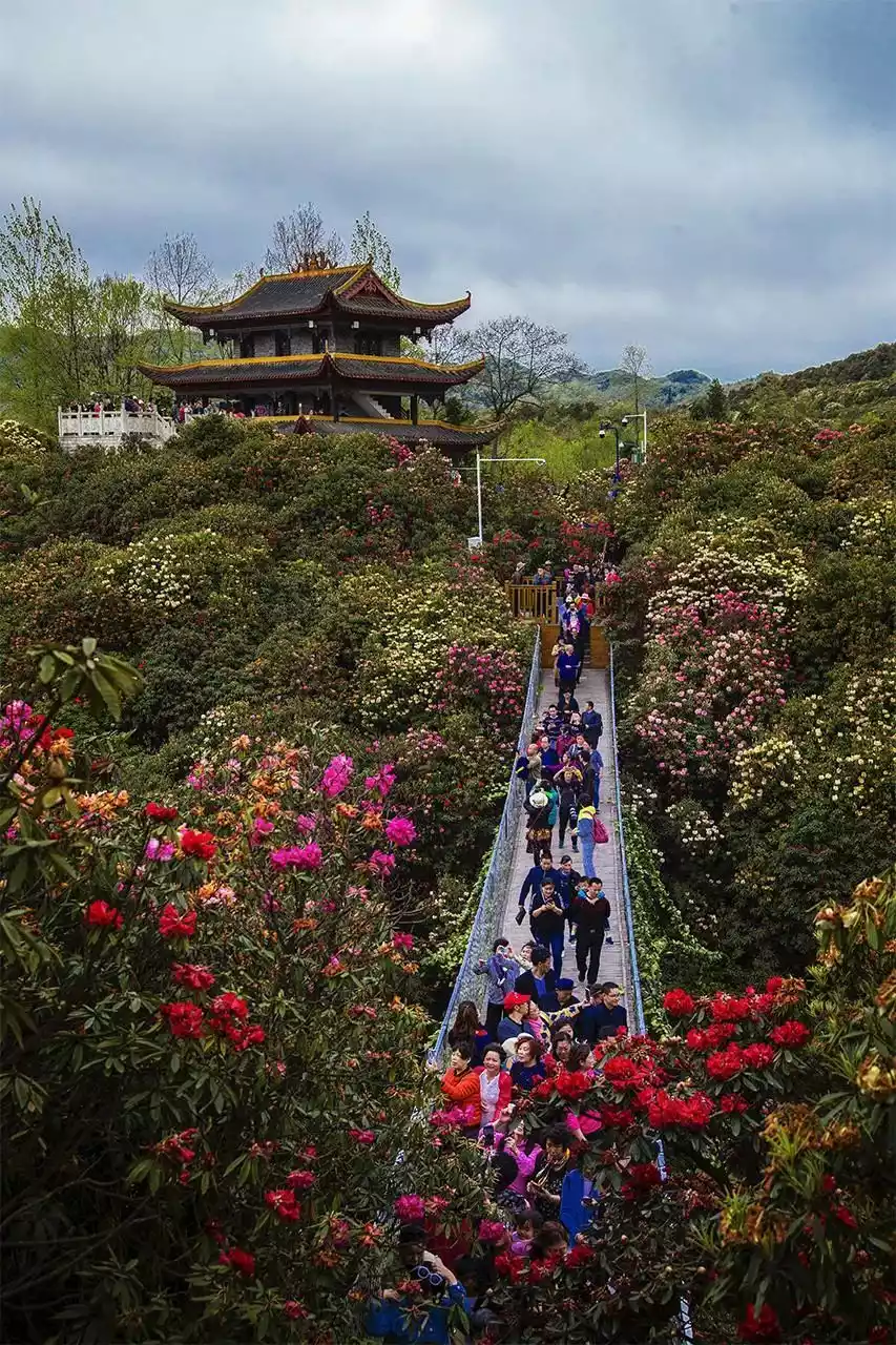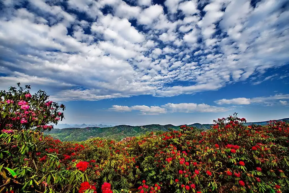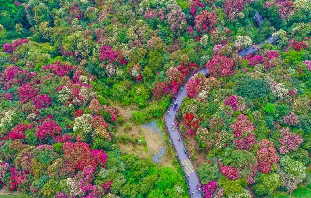 The scenic area includes scenic spots such as Baihuaping, Huameiling, Mayinglin, and Jinpoling. Mayinglin is home to the highest concentration of Maying Rhododendrons within the area. These trees boast tall stature and dense corollas, with some boasting up to 300 flowers. The clusters of blossoms, like balls of blazing fire, burn in the branches, illuminating the sky, the ground, the faces of visitors, and the surrounding mountains.