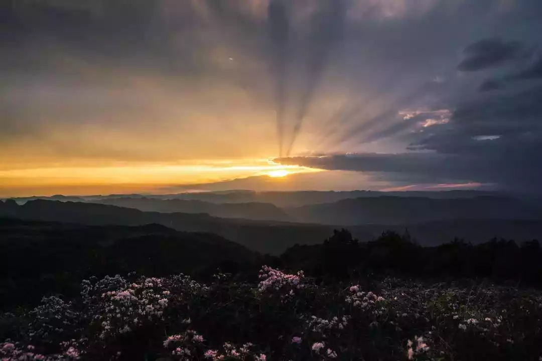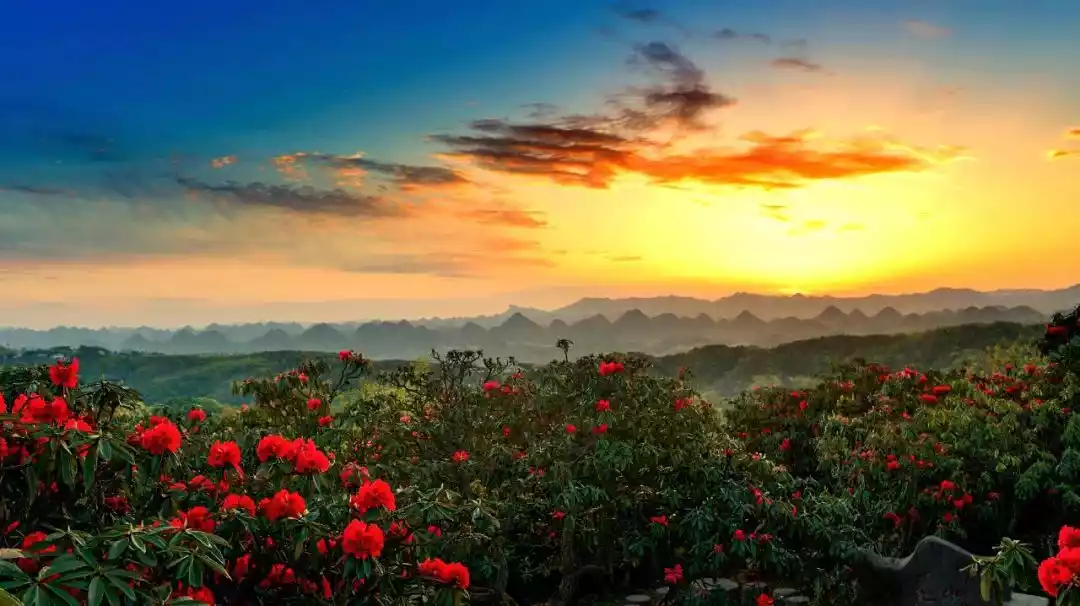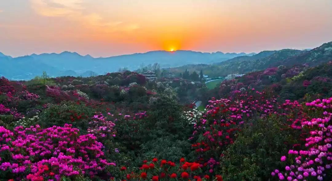 Don't miss the sunrise and sunset amidst the sea of flowers. As the sun rises, the sea of azalea blossoms gradually becomes clearer. The azaleas swaying in the wind drape a vibrant veil over the rolling hills, and at sunset, the entire grassland is bathed in a golden haze.