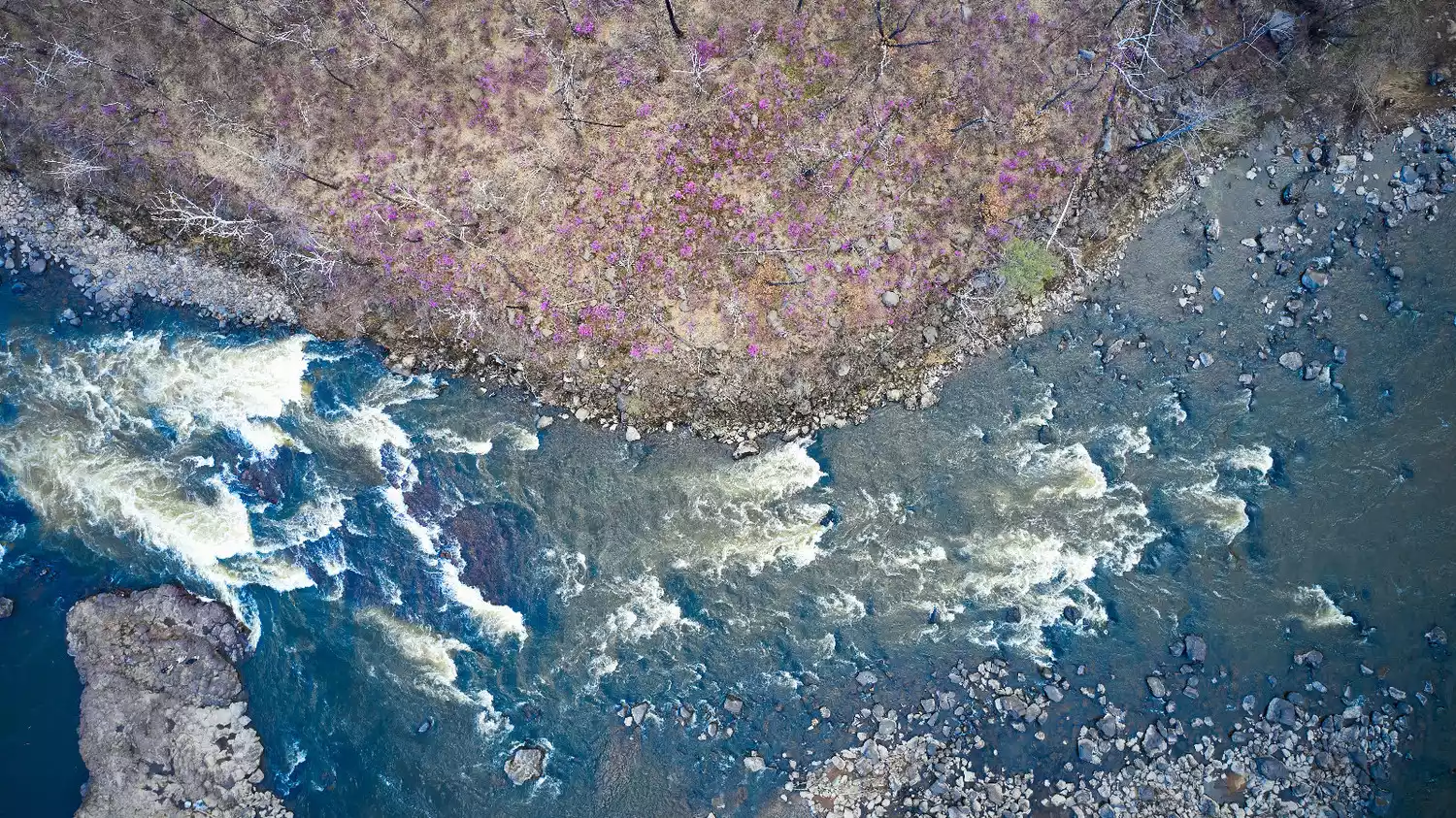 Deep within the Greater Khingan Range, the Bila River region is a natural volcanic lava landscape. Repeated eruptions have blanketed the valley with Asia's largest lava plateau, creating a vast expanse of dark volcanic rock that forms a surging sea of stone. Amazingly, within this vast, almost bare rock pond, azaleas and other plants flourish. Even in this light rain, the lava moss appears even more vibrant and beautiful.