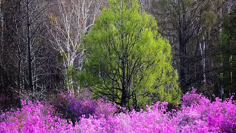 Spring in the north always arrives late. Every April, as the glaciers thaw and life revives, the most distinctive spring flower in the north is undoubtedly the Xing'an azalea. Also known as dazixiang, manshanhong, and azalea, the Xing'an azalea buds through the harsh winter, then blooms in early spring, sometimes even bursting into bloom in the snow. It is the herald of spring in the north.
