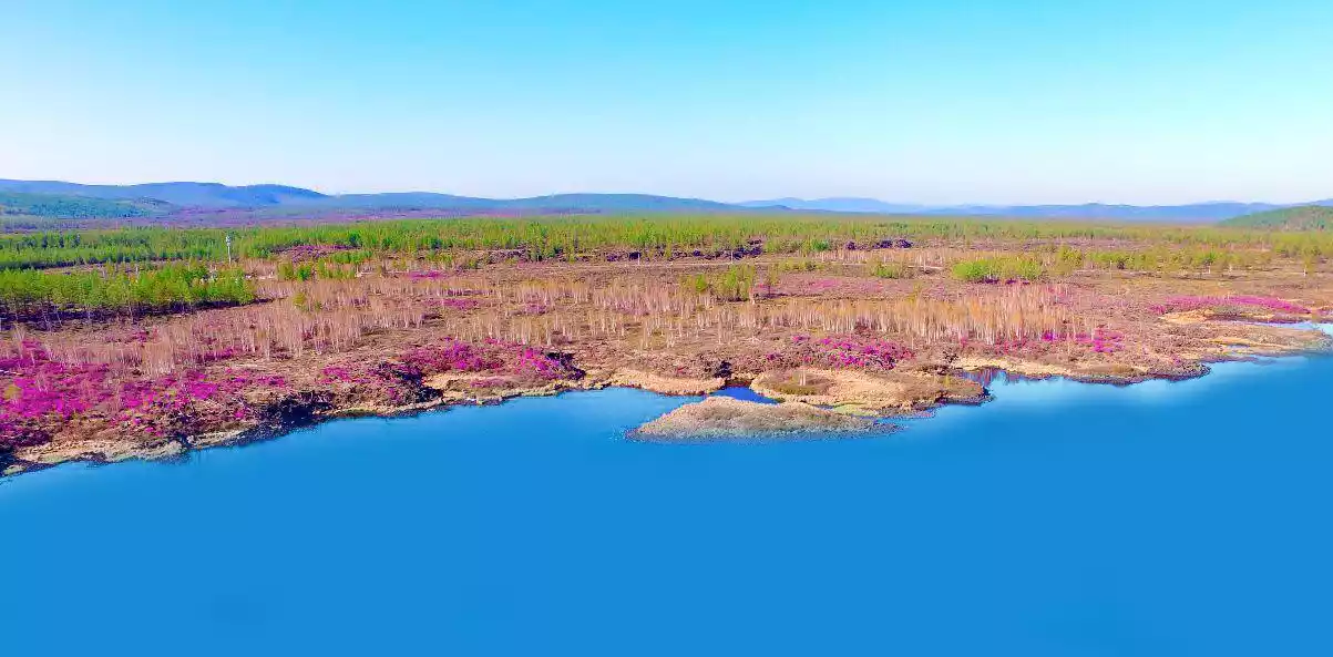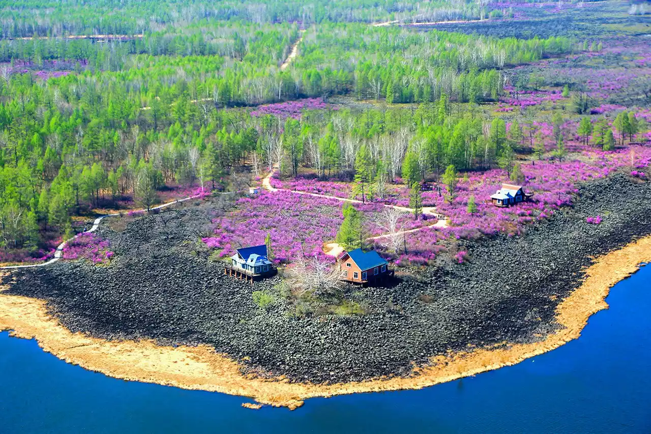 The Jingpo Lake volcano has erupted three times, with lava flowing from its craters and cascading down the valley, blocking the Mudanjiang River and forming Jingpo Lake, the world's largest alpine barrier lake. The lava flowed through the land, leaving behind a lava plateau. This vibrant sea of azaleas is a dazzling radiance etched through the vicissitudes of time.