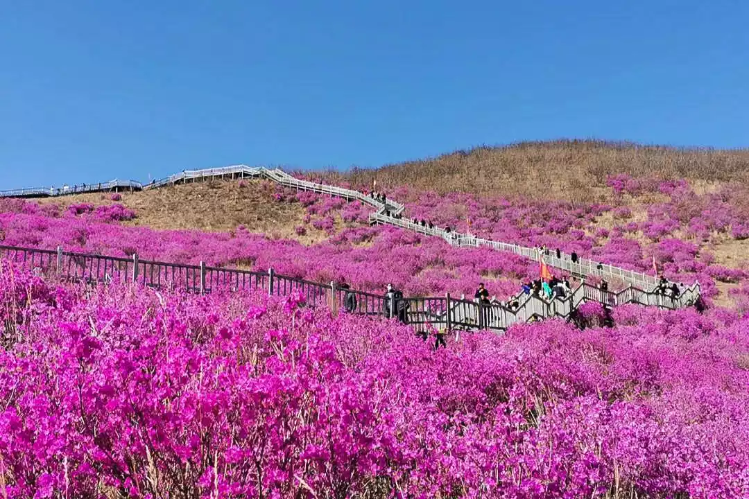 The volcanic azaleas, with their most enchanting colors, gentle eyes, and touching expressions, create a breathtakingly beautiful scene. Walking up the winding plank road, the vibrant colors ahead are eye-opening. Clusters of vibrant crimson blossoms, seemingly swooping from the horizon, are scattered among the rocks. The azaleas are in full bloom, captivating yet proud. Their fresh, refined colors and graceful beauty are truly captivating.