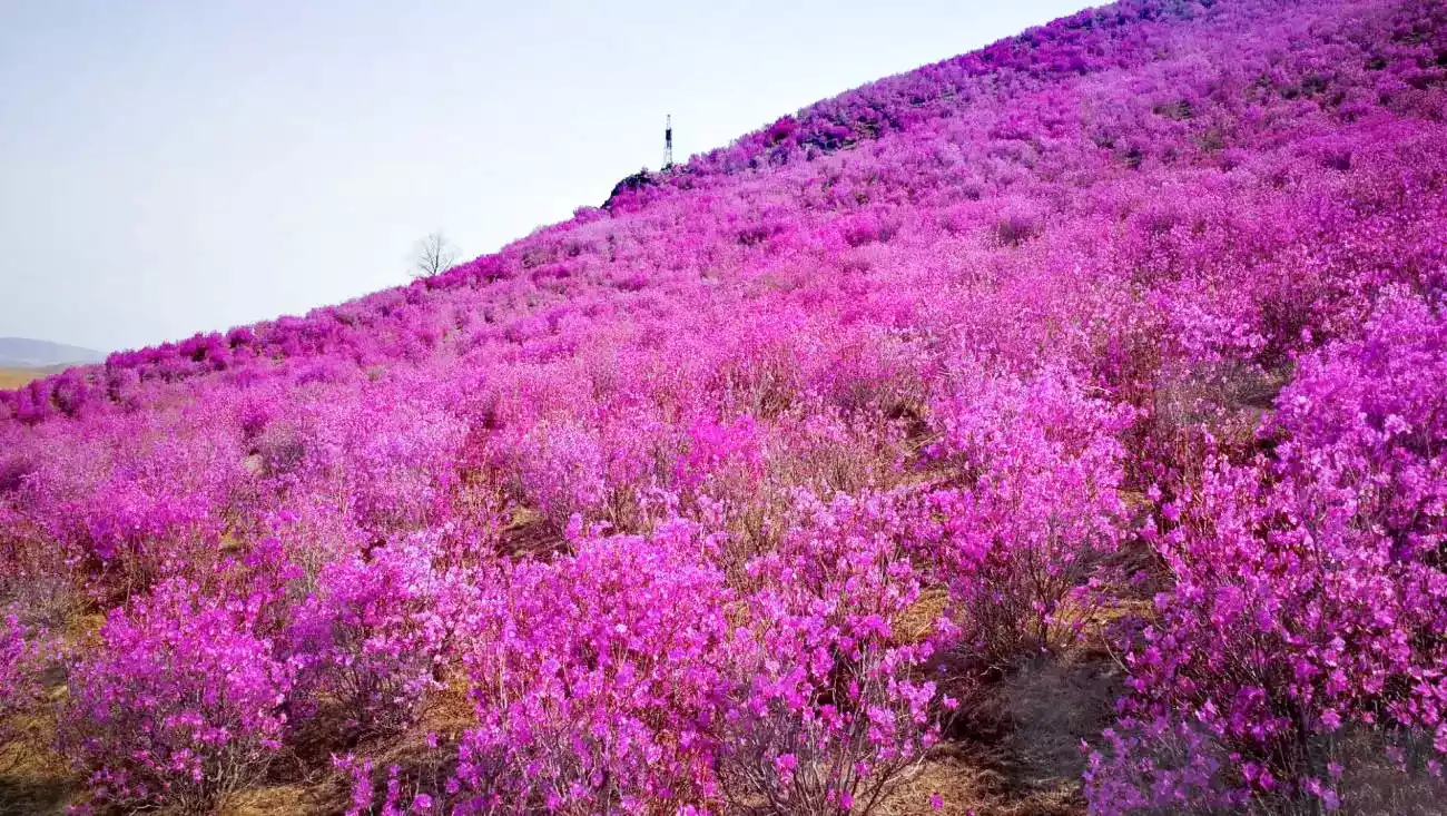 From the city of Zhalantun, looking southwest, you can see the fiery red azaleas blooming on the slopes of Cuiping Mountain, creating a stark contrast to the spring mountains. Continue south along the hillside road, passing oak and apricot groves, and farmland. As the terrain rises, the city panorama unfolds. About 1.5 kilometers, after crossing a hillock, you'll find Cuiping Mountain's Azalea Slope. This area is characterized by its high density of azaleas, and the plants are short (about 1 meter tall). Most notably, the mountain is completely covered with azaleas, devoid of tall trees. It's a perfect spot for photography, flower viewing, and social media posts.