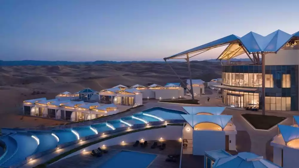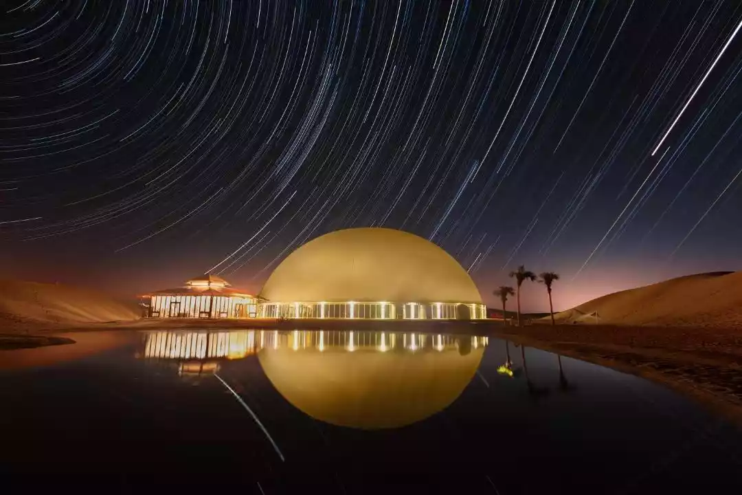 China's first ultra-cool desert-themed hotel, nestled deep in the desert, far from the city, features a five-pointed star-shaped design. Step inside, and the endless desert awaits you as you open the door, and the dazzling galaxy shines through the curtains. To enrich and enrich the guest experience, the hotel also features a 360-degree panoramic restaurant, an open-air bar, five-element sand therapy, a starlit pool, an outdoor afternoon tea set alongside a heart-shaped artificial lake, and a starry sky theater. Evening activities like star photography and lectures are also offered. It's quite a treat!