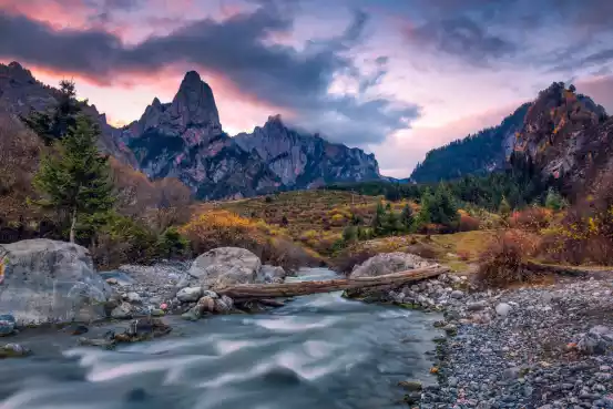 This is a canyon basin surrounded by mountains, where verdant pines and cypresses contrast beautifully with the purple-red sandstone. A small stream, the Bailong River, flows through the town. North of the stream, in Gansu province, is the Dacang Langmusaichi Temple; south of the stream, in Sichuan province, is the Geladi Temple. Together, the two temples form the Langmusi Temple. Langmusi possesses a tranquil and serene beauty, where mountains, grasslands, pine forests, and streams converge.