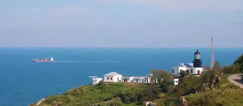 The azure sea, fine sand, and blue and white buildings evoke a romantic, seaside charm reminiscent of Santorini. At the northern end, a century-old lighthouse, built in 1870, has survived years of war.
