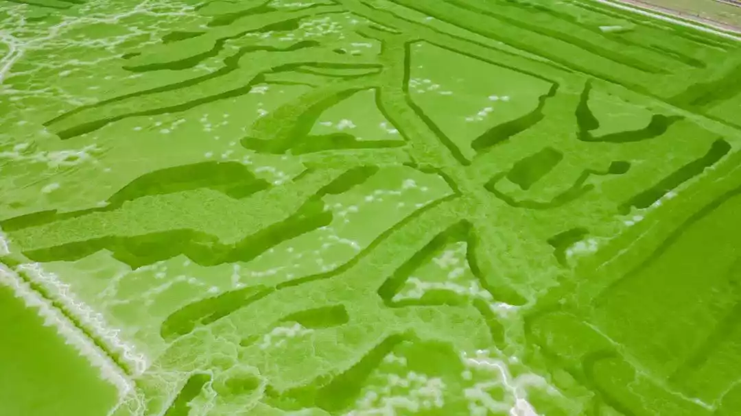 White Thousand Island salt flowers are scattered all over the lake, like lace ribbons, dividing the green into different shades, presenting beautiful Chinese colors.