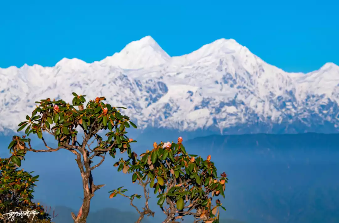 The river is filled with mist, the distant mountains are shrouded in clouds and mist, the valley is quiet, and the blooming rhododendrons in thousands of acres are in brilliant colors, which contrast with the sea of clouds on the mountain tops, adding infinite vitality to the green mountains.