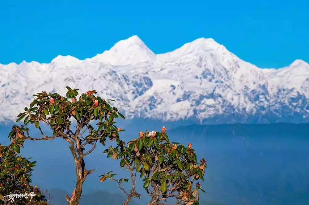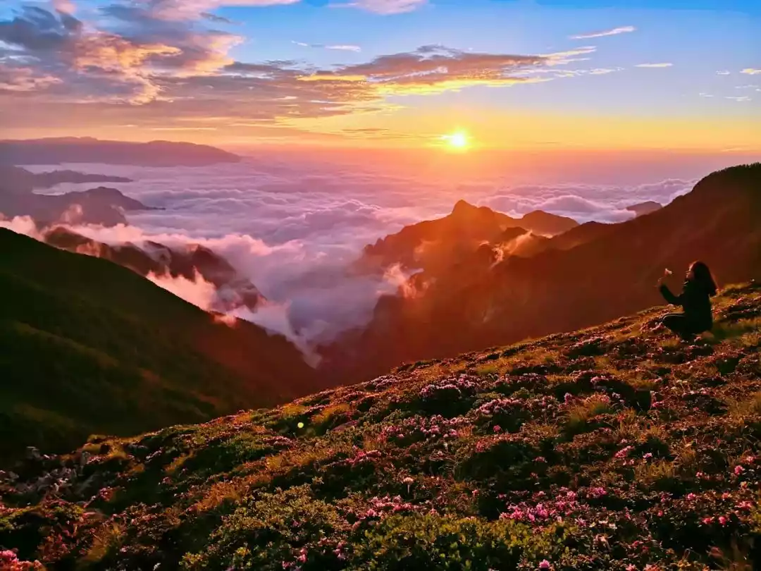 Thousands of acres of rhododendrons in full bloom are in brilliant colors, contrasting beautifully with the sea of clouds on the mountain top, adding infinite vitality to the green mountains.
