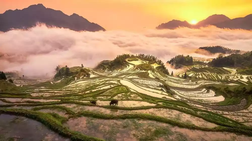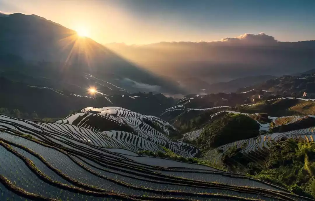 June is the month when you can see Longji irrigation and farmers planting rice. When the terraces are filled with water, the layers of terraces sparkle like morning mist and morning glow.
