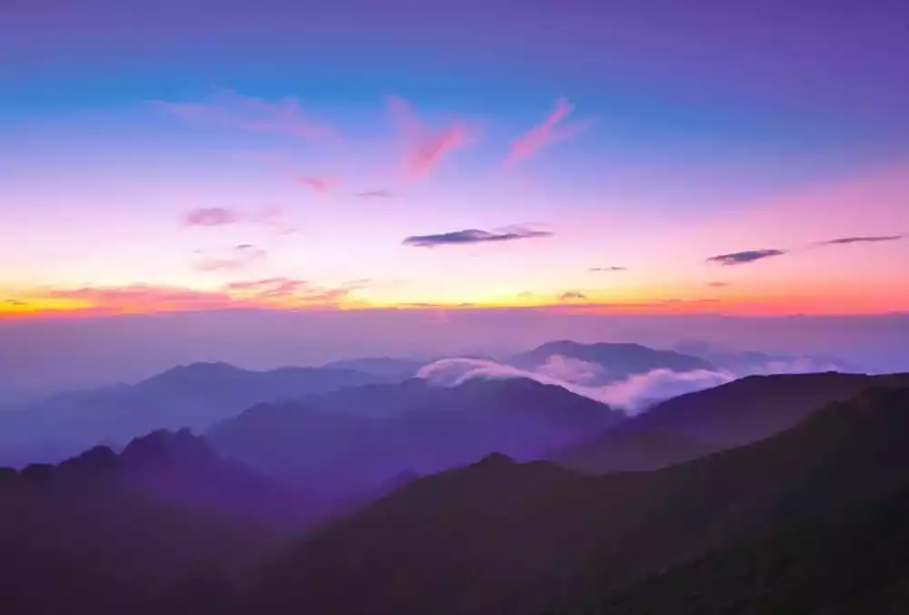 The mountains in the distance were shrouded in thick clouds, with only their peaks, high and low, visible. They were bathed in a fairyland of overlapping colors such as lavender, pale pink, pale blue, and pale gray.