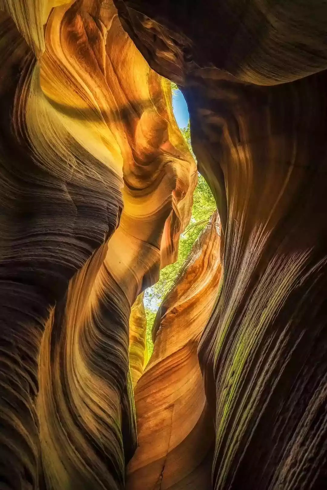 When you stroll through the wide or narrow corridors of the Yucha Grand Canyon, you will see the green moss on the cliffs on both sides, which complement the wavy colors of the rock walls under the light.