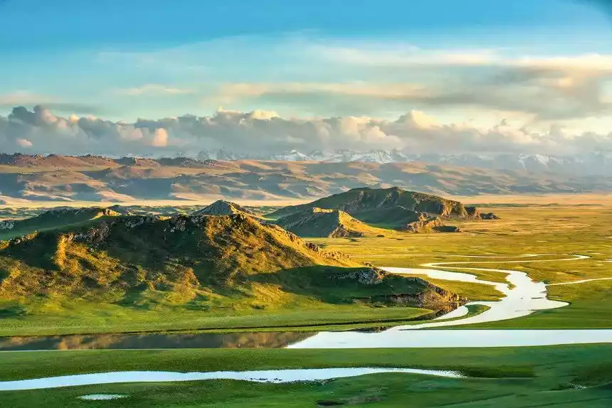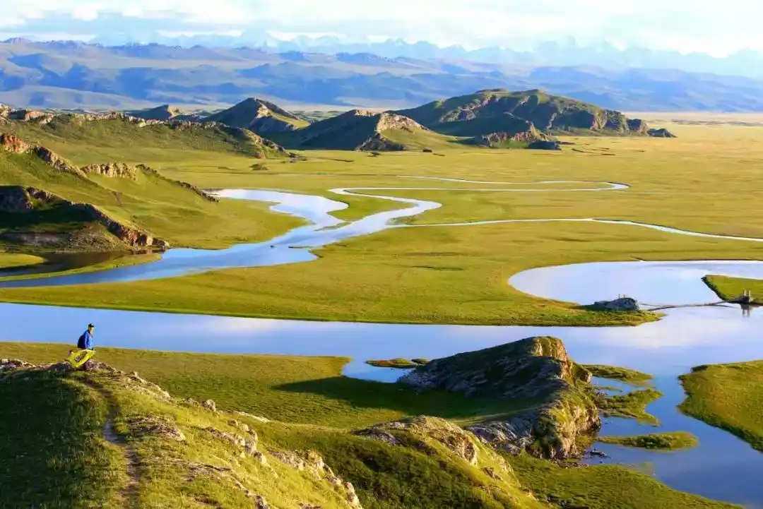 It is surrounded by high mountains, with lush wetlands and grass, dotted with cattle and sheep on the grasslands, and winding rivers. If you find the right angle at sunset, you can see "nine suns".