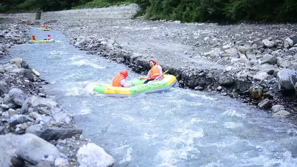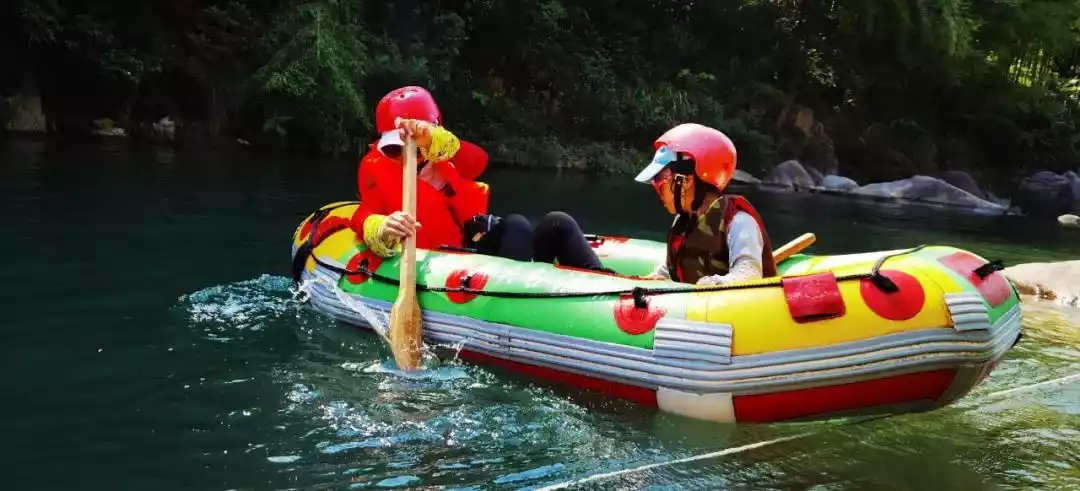 Besides the internet-famous dam, the Huyuan Creek rafting, known as "Fuchun's No. 1 Rafting," is the highlight! The rafting course is 3.1 kilometers long, with a total drop of 60 meters and five rapids. The entire rafting journey takes about 1.5 hours.